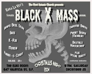 Karla LaVey’s Satanic Church Radio Show can be heard every Wednesday from 6-8 P.M. (Pacific Standard Time) in the San Francisco Bay Area on Pirate Cat Radio at 87.9 F. M. or via live feed online at http://www.piratecatradio.com/ worldwide. CD’s may be submitted for play by sending them to the First Satanic Church at P.O. Box 475177, San Francisco, Ca 94147.